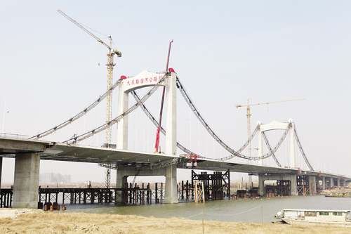 昨天上午,記者登上大慶路淮河公路橋主橋面時(shí),熱鬧的施工現(xiàn)場(chǎng)與寒冷的天氣形成了鮮明的對(duì)比。大橋最南端的接線(xiàn)上,幾臺(tái)機(jī)器正在攤鋪?zhàn)詈笠粚訛r青。大慶路淮河公路橋建設(shè)指揮部技術(shù)質(zhì)量部部長(zhǎng)薛峰告訴記者,橋面瀝青一天之內(nèi)就能鋪好。“瀝青是最后一道主要工序,完成后就標(biāo)志大橋主體大功告成了。”